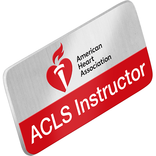 This brushed silver lapel pin features the American Heart Association logo on the top half and "ACLS Instructor" in a red stripe on the bottom. 1.25" x .5"