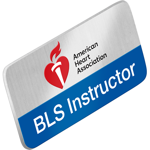 This brushed silver and blue lapel pin features the American Heart Association heart and torch logo on the top half and identifies the wearer as a BLS Instructor in a blue stripe on the bottom.