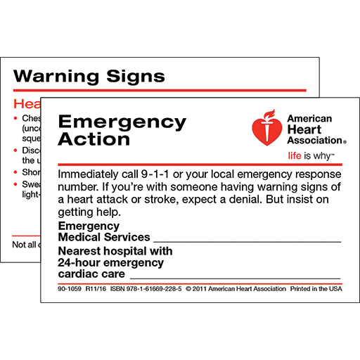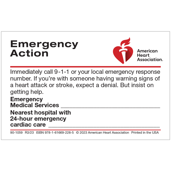 This is a pack of 50 Emergency Action wallet cards. These 3"x2" cards provide vital information on how to react to various medical emergencies.They are made or use by the general public and can also be used as a tool to promote the importance of CPR and first aid training.