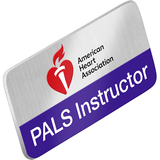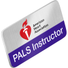This brushed silver and purple lapel pin features the American Heart Association heart and torch logo on the top half and identifies the wearer as a PALS Instructor in a purple stripe on the bottom.